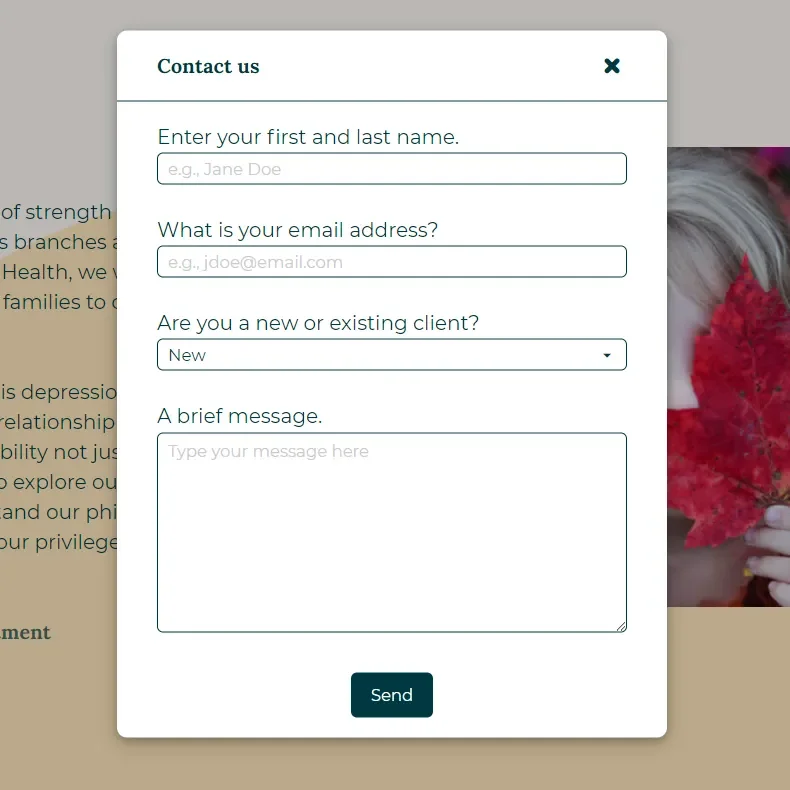 Clicking “Send” would then send the message to the selected therapist. In the cases of a new client, it would be sent to the head therapist to coordinate.